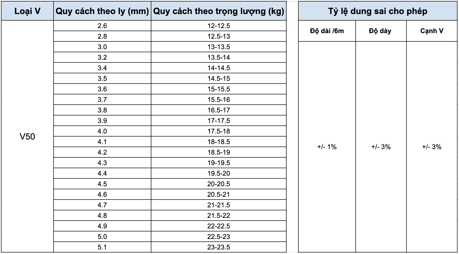 - Thép hình V50 phải có độ cứng và khả năng chịu tải phù hợp với công trình, đảm bảo không bị biến dạng dưới tác động của trọng tải và môi trường.