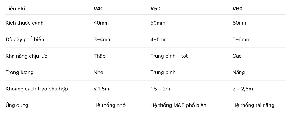 Trong thực tế thi công, nhiều kỹ sư thường ưu tiên V50 hoặc V60 để đảm bảo khung đỡ chắc chắn và hạn chế tình trạng cong võng khi hệ thống vận hành lâu dài.